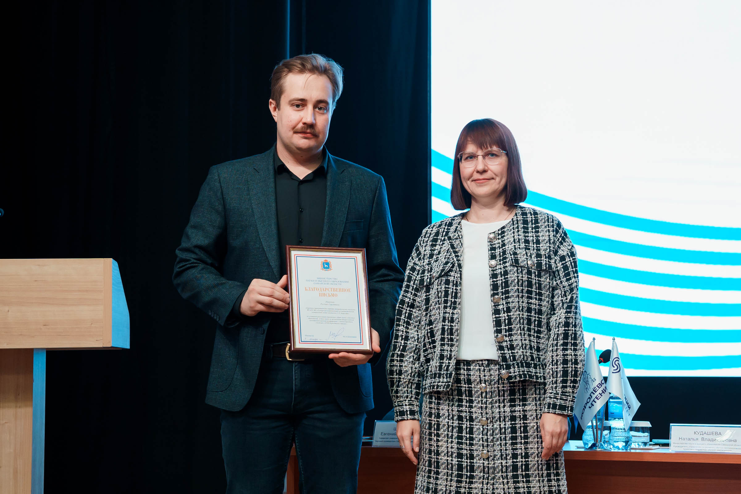 Руководитель управления Минобрнауки Самарской области Наталья Кудашева вручила благодарственные письма трем молодым сотрудникам Самарского университета им. Королёва: директору Центра проектного развития и обучения Марии Клёвиной, старшему преподавателю кафедры теоретической механики Руслану Пикалову и инженеру-конструктору Инжинирингового центра Даниилу Искворину. Этой награды они удостоены за успешную реализацию проектов в сфере науки и высшего образования.