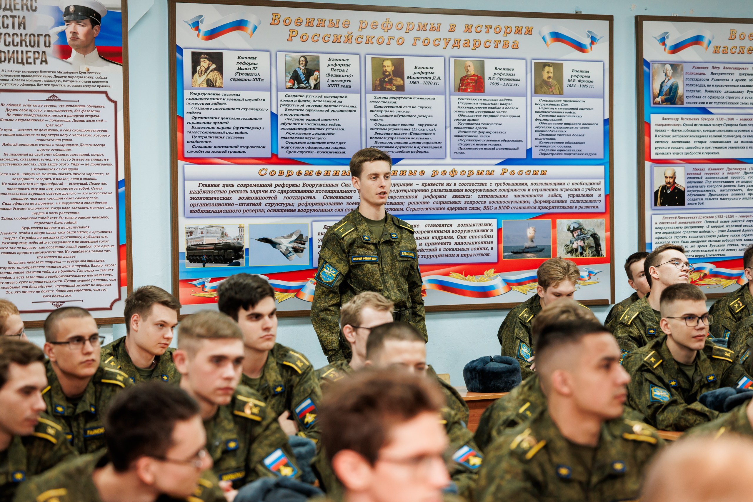 Курсанты военного учебного центра задавали вопросы о самых сложных и запомнившихся полётах, о том, какие самолеты оставили самые яркие впечатления, какие качества важны для военного лётчика сегодня и как строить свой профессиональный путь, если хочется связать жизнь с авиацией и службой.