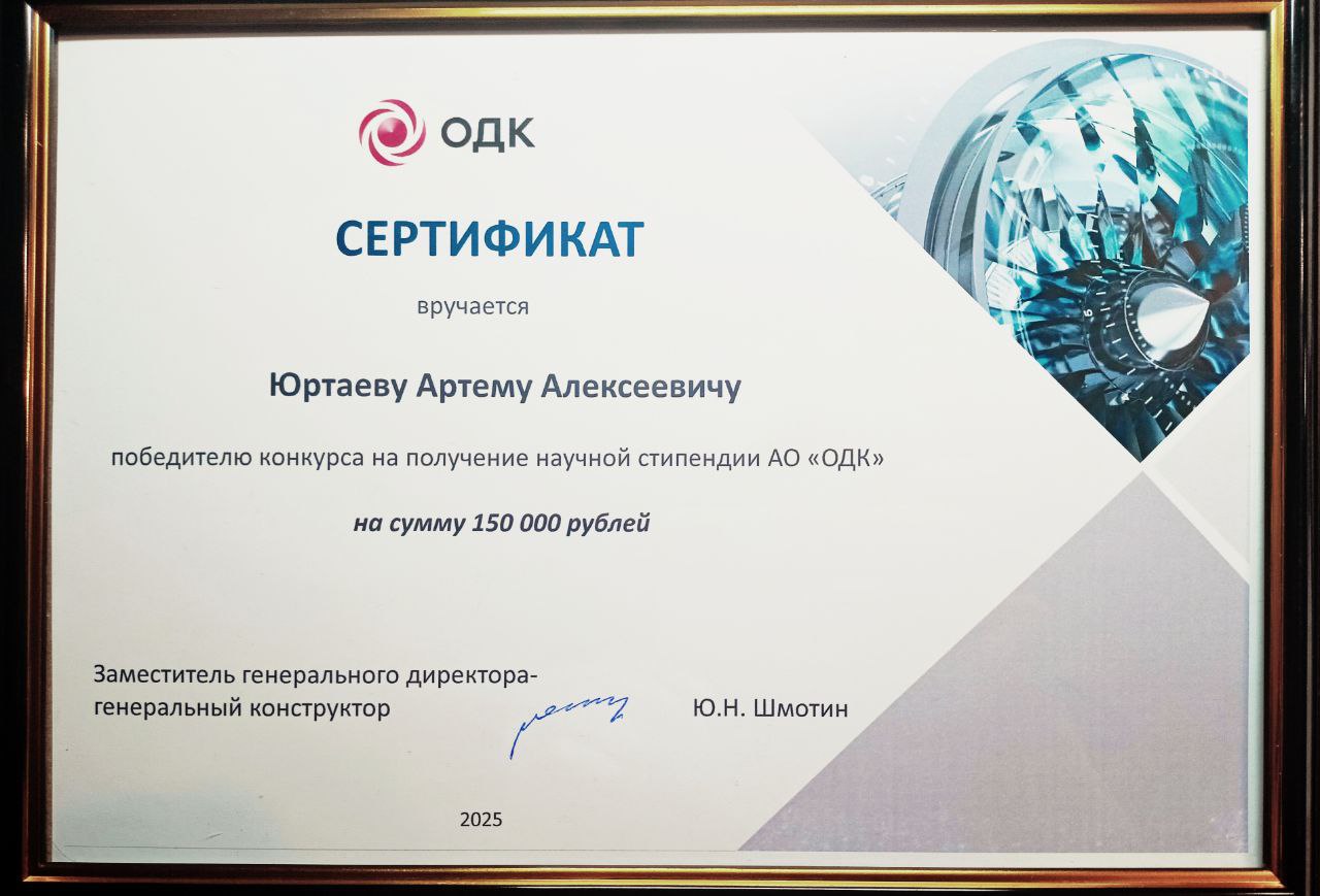 3 декабря 2025 года на торжественной церемонии в Москве сертификаты стипендиатам вручали заместитель генерального директора – генеральный конструктор ОДК Юрий Николаевич Шмотин и руководитель департамента управления знаниями и развитием персонала подразделений НИОКР ОДК Татьяна Викторовна Томилина.